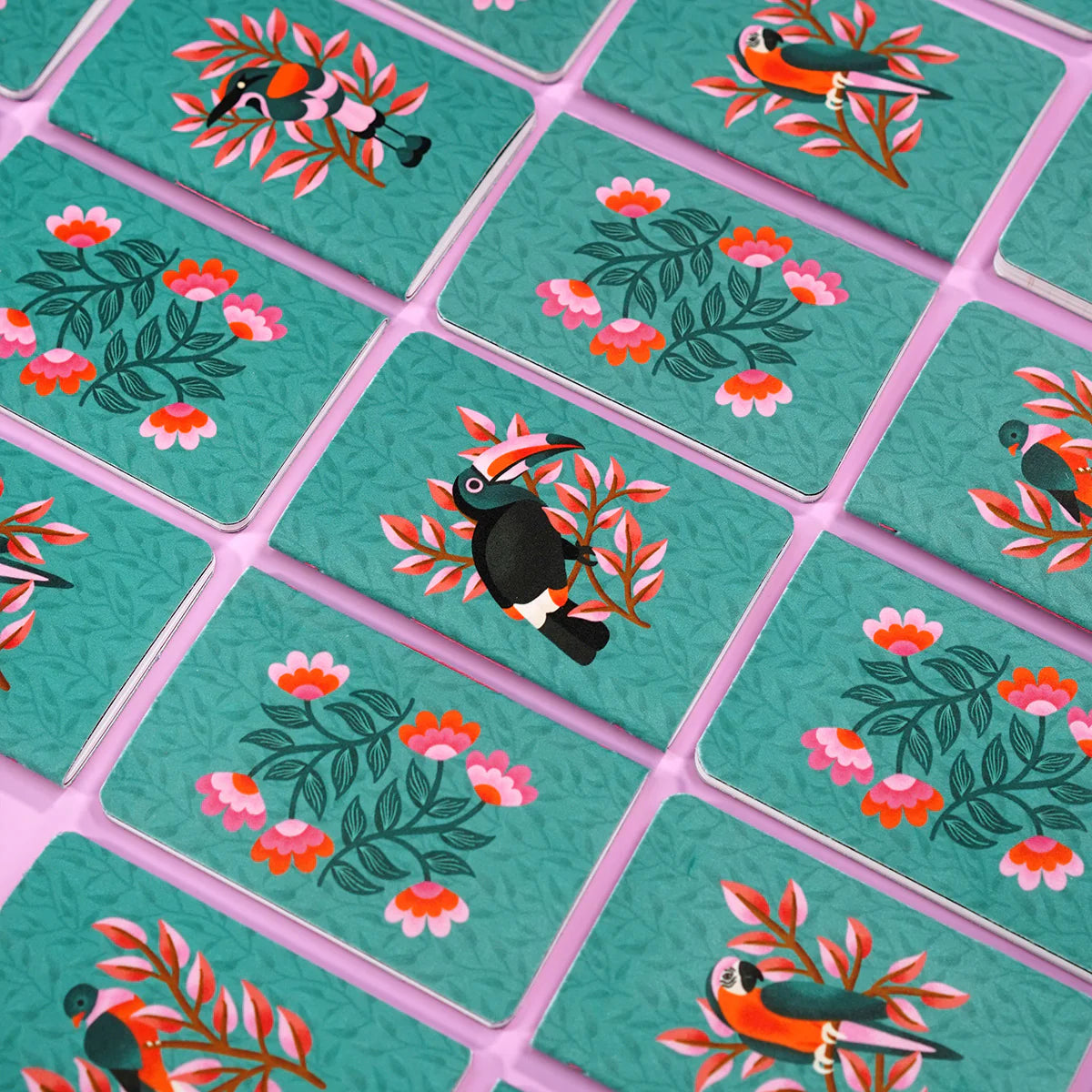 For our collaboration we went avian and created four cover designs each with a different bird: toucan, macaw, quetzal, and guardabarranco. You will be receiving one bird at random. The birds are colored in classic Molina tones with vibrant pinks, oranges, and various shades of green."