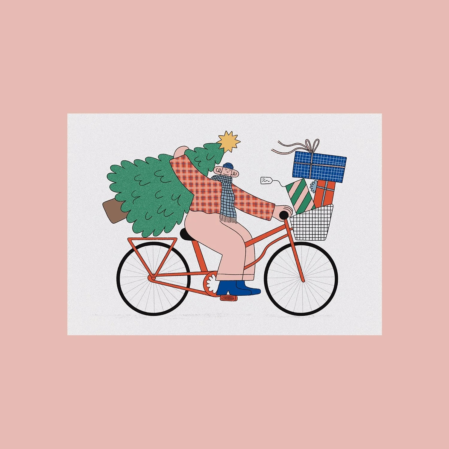 Gorgeous card featuring someone bravely carrying a Christmas tree on their bike!