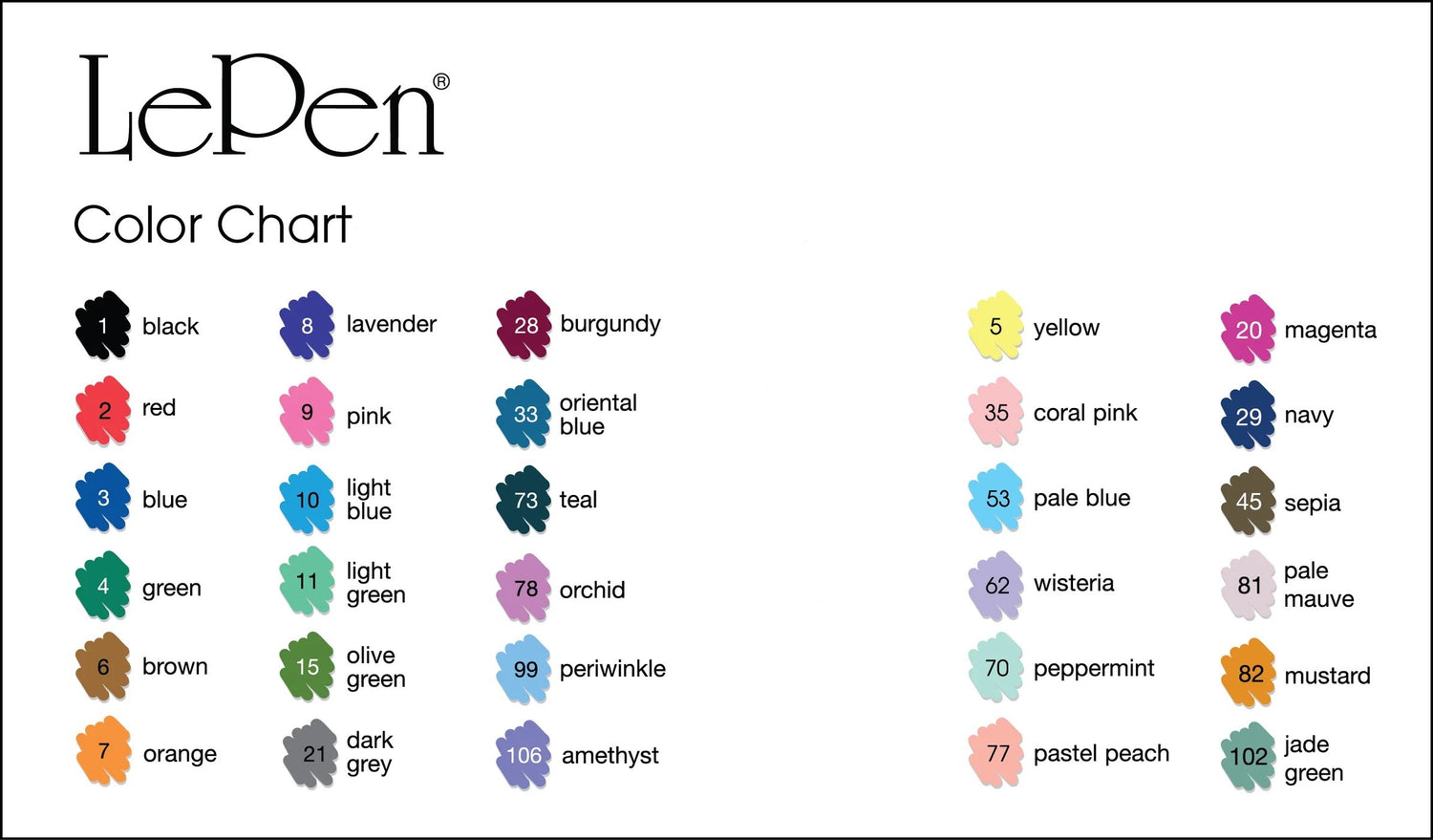 Comes in 29 colours; Black, Red, Blue, Green, Brown, Orange, Lavender, Pink, Olive Green, Burgundy, Oriental Blue, Coral Pink, Wisteria, Peppermint, Teal, Pastel Peach, Periwinkle, Amethyst, Mustard, Jade Green, Yellow, Pale Blue, Navy, Light Green, Sepia, Magenta, Dark Grey, Orchid & Pale Mauve.
