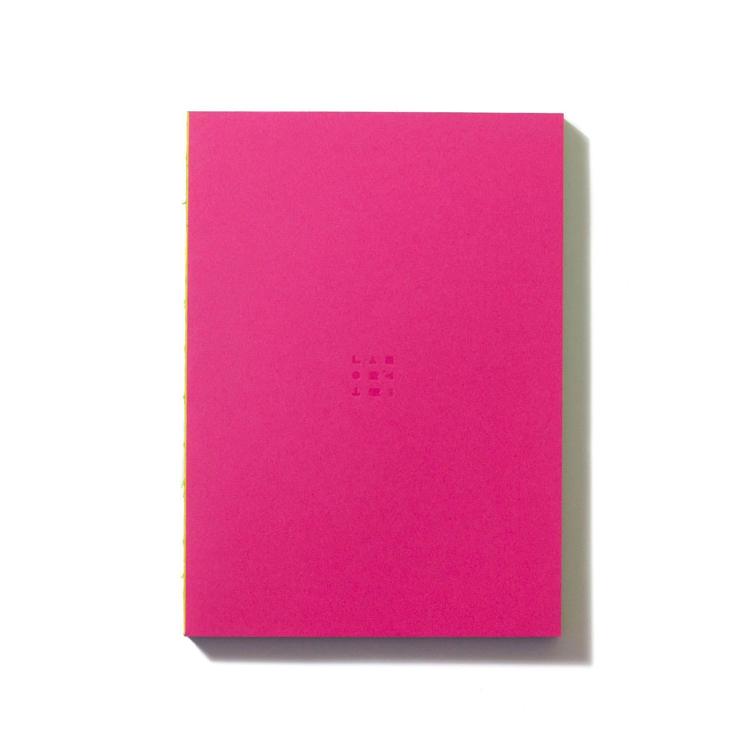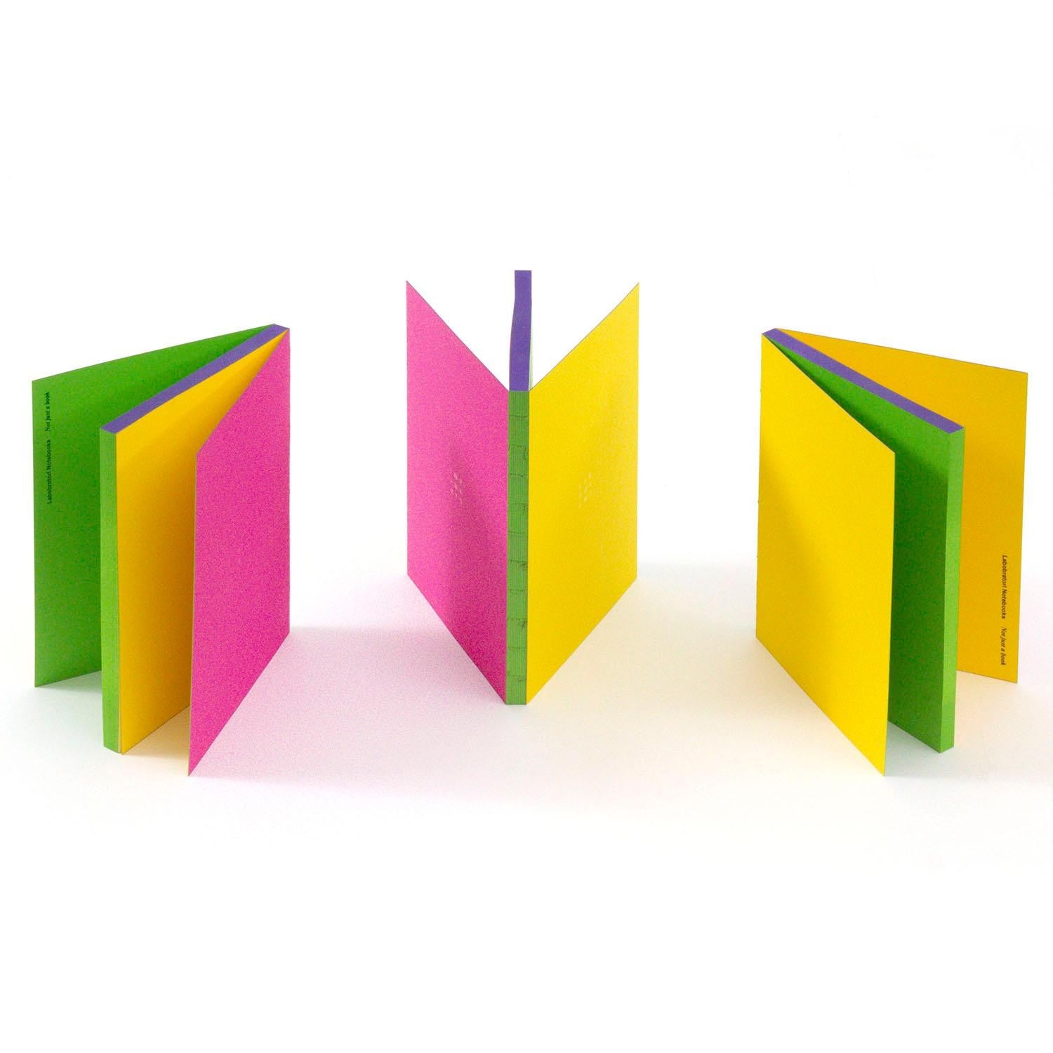 A beautiful bright colour-block notebook with exposed flatlay binding, and a soft cover.
